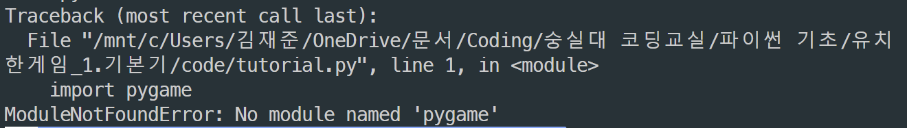 Pygame 모듈을 사용하여 게임 프로그래밍 코드을 작성하던 중, 모듈이 설치되어 있지 않다는 오류가 발생하여 문제를 해결하느라 몇시간동안 끙끙 앓았다 😭