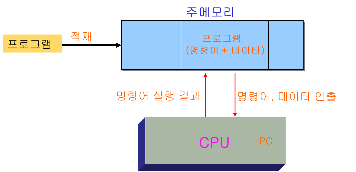 - 메모리에 프로그램(명령어와 데이터) 저장