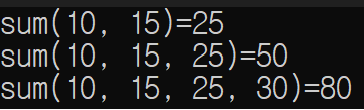4개의 인자를 받는 sum함수를 만들어서 인자가 2개 넘어가는 경우, 3개 넘어가는 경우, 4개 넘어가는 경우를 출력해보자.