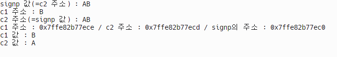 cout << "signp 값(=c2 주소) : " << signp << endl; // signp가 가리키는 메모리에 저장된 값, 즉 'A'를 출력합니다.
