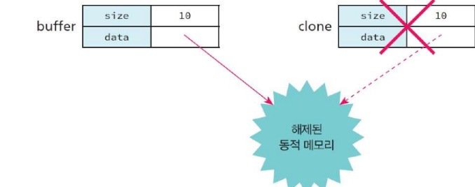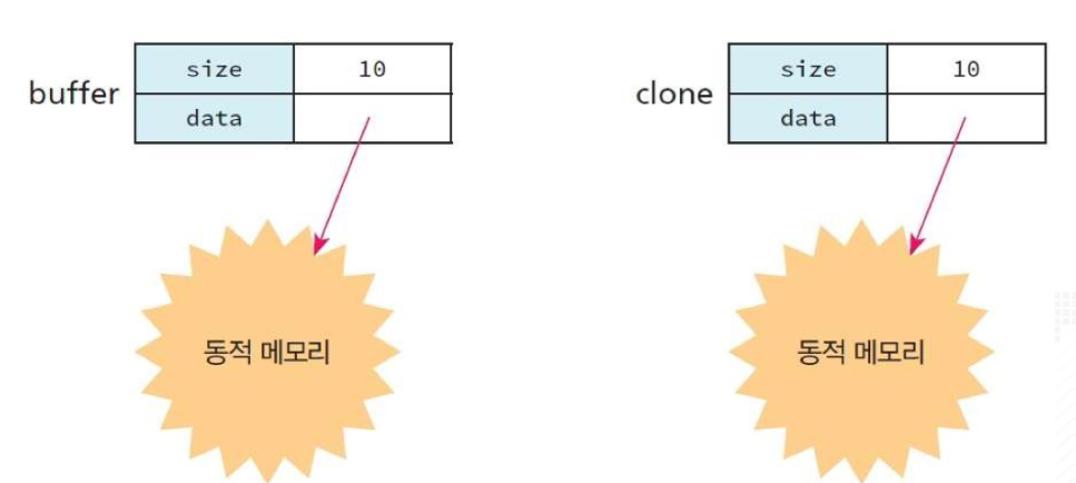 - 얕은 복사(shallow copy) : 지역 변수인 clone이 소멸되면서 이름을 저장한 메모리 공간을 반납하게 되고 동일한 공간을 다른 변수 buffer가 사용하려고 하는 문제