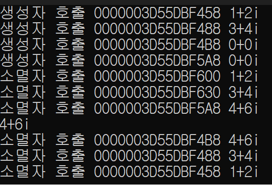 class Complex { public: double real, imag; Complex(double r = 0.0, double i = 0.0) : real{ r }, imag{ i } { cout << "생성자 호출"; print(); } ~Complex() { cout << "소멸자 호출"; print(); } void print() { cout << real << "+" << imag << "i" << endl; } };