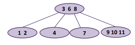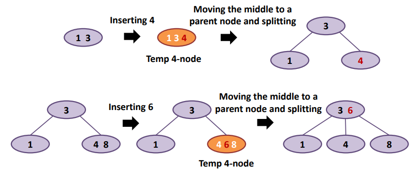 - 부모가 3개의 값을 가지면 계속 분할하여 중앙값을 뽑고 필요한 경우 새 루트 노드를 구성한다.