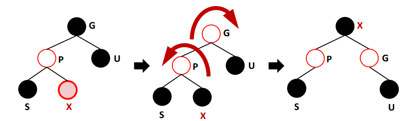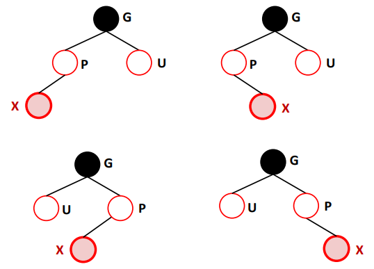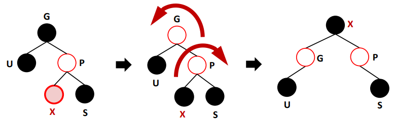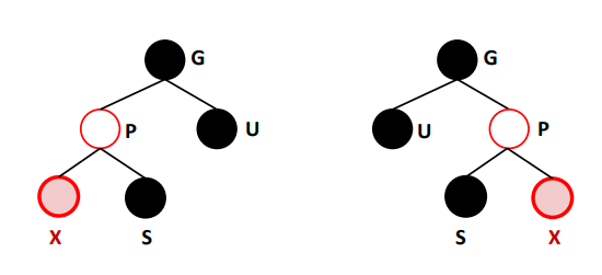 - Case 4: 1) 삽입되는 X의 노드의 Uncle 노드가 Black이고 삽입되는 위치가 왼쪽 Subtree의 오른쪽 Node인 경우 | 2) 삽입되는 X의 노드의 Uncle 노드가 Black이고 삽입되는 위치가 오른쪽 Subtree의 왼쪽 Node인 경우