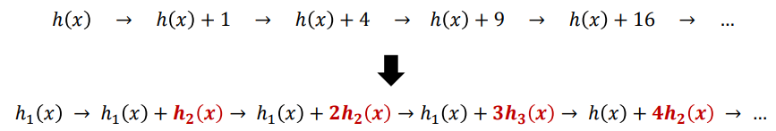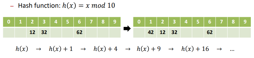 | Quadratic probing | * ℎ (𝑥) + inc ∗ inc mod M 순서로 빈 버킷을 검색하는 해결책이다. * ex) h(x) = x mod 10 ![]() * Clustering과 Coalescing 문제를 피할 수 있는 좋은 해결책이다. |