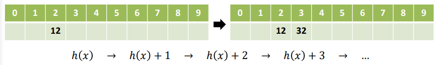 Linear Probing | * bucket이 가득 차면 빈 bucket 을 찾을 때까지 다음 bucket 으로 이동하는 해결책이다. * ex) h(x) = x mod 10 ![]() * 그러나 이 문제는 Clustering과 Coalescing이 발생하는 문제가 생긴다. (ex. 나머지가 다 2면 해시함수의 의미가 없어짐->2개 이상의 그룹이 서로 얽히고 얽혀짐->해시함수 기능 저하) – Clustering: elements are grouped – Coalescing: two adjacent groups are merged |