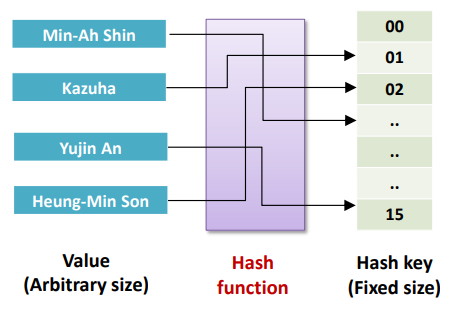 - 임의의 크기의 값을 고정된 크기의 값으로 매핑하는 데 이때 해시 함수를 사용한다.