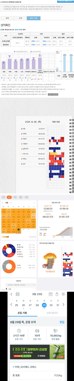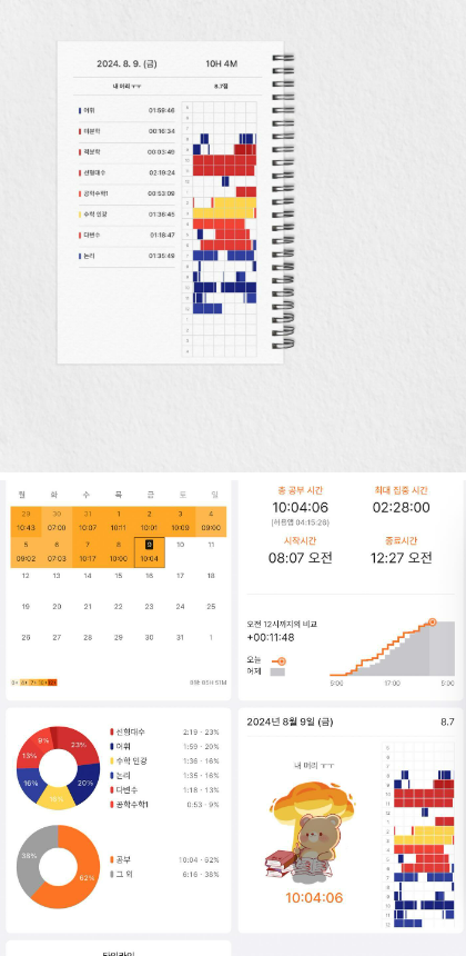 24.08.21 (수) 그동안의 피로가 싹 몰렸던걸까 오늘 완전히 푹 자버려서 9시 50분에 기상했다. 그래서 늦게 운동하고 늦게 공부 시작해서 공부시간이 잘 안나왔다. 그래도 나름 기본적인 것들은 다 해놓아서 다행이긴 하지만... 오늘은 좀 일찍 자서 다시 원래대로 일상패턴 되돌려야겠다..ㅎ