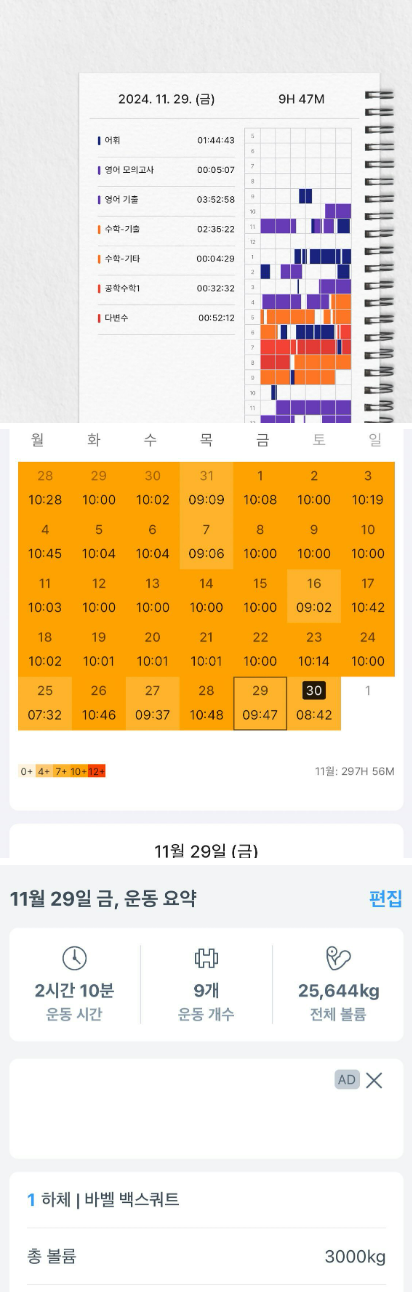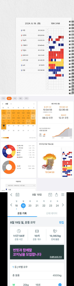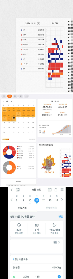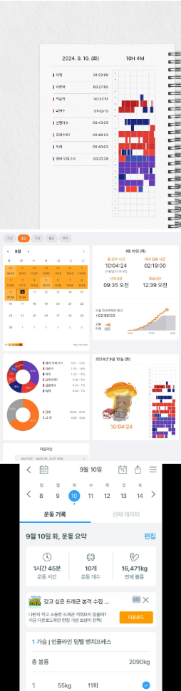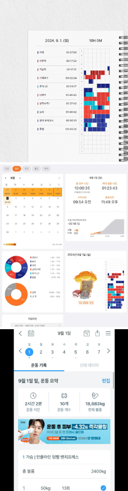 24.08.04 (일) 오늘은 아침 6시 반에 일어나서 2시간정도 공부하고 바로 헬스장가서 마운팅으로 40분 달렸다.(근력 운동은 쉬는날) 이렇게 알바하는 날도 시간 쪼개서 공부하니 공부시간 9시간은 확보해서 너무 좋았다. 앞으로도 이렇게 일찍 일어나고 싶다.(물론 오늘은 이제 자니까 안되겠지만..😢)