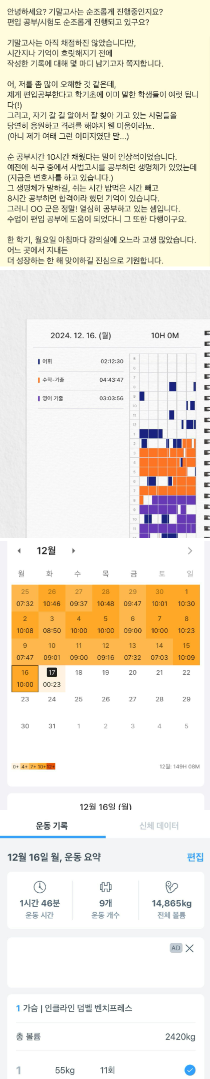 24.12.16 (월) 학교 교양과목 교수님이 써주신 응원글 보고 감동받았다 🥺 이제 월요일 교양과목 기말고사도 클리어! 이제 전공과목 하나하고 교양과목 하나만 더 시험보면 진짜 종강이다..! 좀만 버티자!