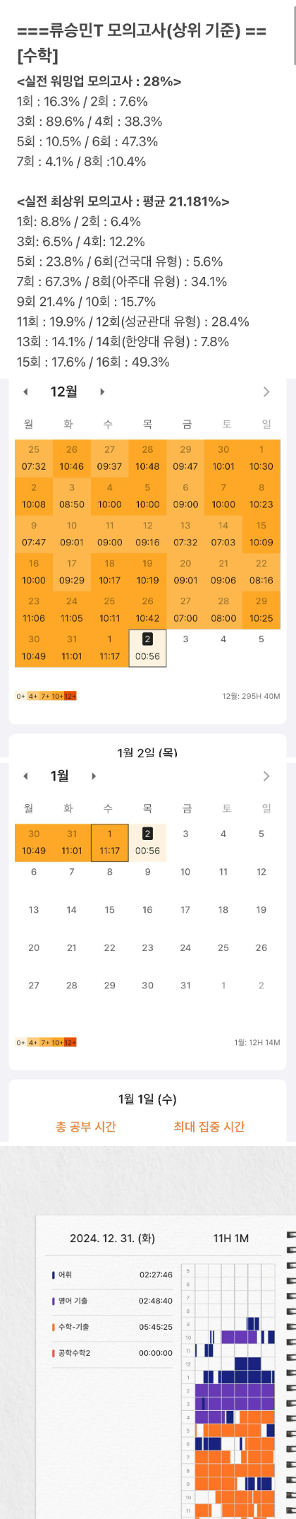 24.11.23 (토) ~ 24 (일) 깜박해서 토일꺼 한꺼번에 몰아서 올린다..ㅎㅎ 토요일 최상위 모의고사는 내가 느끼기에 어려운 부분이 많이 나와 제대로 못풀거나 쫄아서 상위 20프로 밑으로 내려갔다. 그래도 일요일 건대 영수 통합모의고사에서 다시 상위 10% 올라가서 다행이지만,, 감으로 찍어서 운좋게 올라간 것도 있으니 운좋게 맞은 것도 다 복습하자!!
