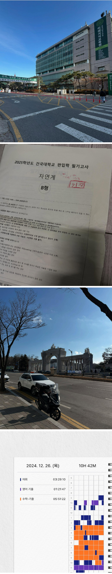 24.12.26(목) - 24.12.28(토) 첫 고비인 건국대, 경희대 시험이 끝났다. 편입할 때부터 ”아, 올킬당하면 어떡하지?“ 하고 맨날 근심걱정하면서 공부를 했는데, 건국대 시험 후 91점 나온거 보고 안도감을 얻었다. 비록 고려대 편입에서 1차 시험에서 불합격했지만, 건국대 이상은 보장될 것 같다라는 마음으로 앞으로 다른 학교들도 편안하게 공부할 수 있을 것 같다.(물론 더욱 빡세게 공부!!!) 경희대도 시험을 끝냈으나, 산수가 매우 지랄맞았다. 경희대는 인간계산기를 뽑는 것인가.. 결국 중간에 계산실수하면서 4문제는 찍었다.