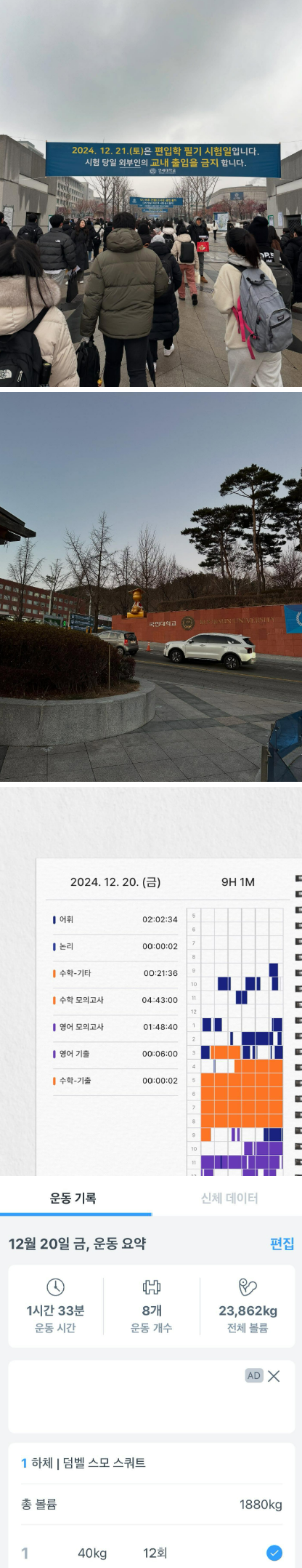 24.12.13 (금) - 24.12.15(일) 이틀 동안 기말고사 하나와 고려대 편입시험을 응시하느라 정신이 없었다. 교양 과목 기말고사는 벼락치기로 그럭저럭 잘 본 것 같아 학점은 인정될 것 같고,, 고대는 너무 쉽게 나와 좀만 더 개념적인 부분 공부했으면 어땠을까 하는 아쉬움이 남아있었다. 무엇보다 수학에서 잔실수가 살짝 있었고,, 이제 남은 학교 공부나 철저하게 잘하자! 기말고사 귀찮은 과목도 끝났겠다 월요일부터 제대로 달려 😎