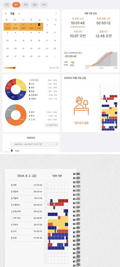 24.08.10 (토) 플래너 위치와 크기를 바꿔보았다. (뭔가 잘 안보이는 것 같아서..) 이걸로 이제 당분간 시험날까지 쭉 고정! 오늘은 늦게 시작했지만 그래도 피곤하지 않게 잘 마친 것 같았다. 나에게 일찍 일어나는건 진짜 무리인지 그냥 이 시간대가 잘 맞는 것 같기도 하다.(개강날에는 어떡하지..?)