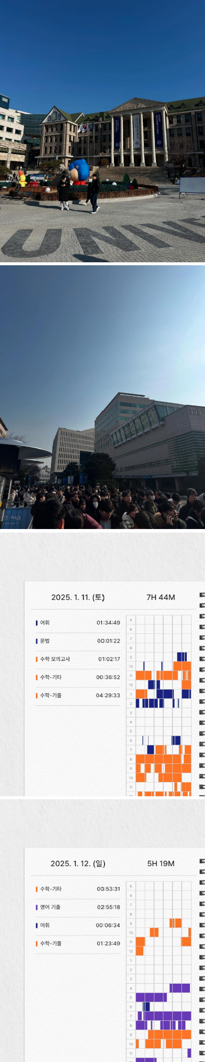25.01.02(목) - 25.01.05(일) 후 건국을 잘봐서 좋았으나, 이번엔 살짝 기분이 우울했다. 3일 홍대시험에서는 그럭저럭 본 느낌 들었으나, 성대 시험에서는 2문제나 실수해버린 것이었다. 영어에서 승부 걸어야 할텐데 느낌이 별로 좋진 않다 ㅜㅜ 서강대 시험은 그냥 풀 수 있는대로 풀어서 그닥 이무 느낌은 안났지만 성대시험 때문에 너무 안타까운 느낌이 들었다. 그래도 갈등, 위기가 없는 스토리는 스토리가 아니니.. 복기된 성균관대 문제들 중 내가 오개념 잡았던 부분들 후딱 오답정리하고, 남은 학교인 한양, 중앙, 시립대 잘보고 끝내자!!